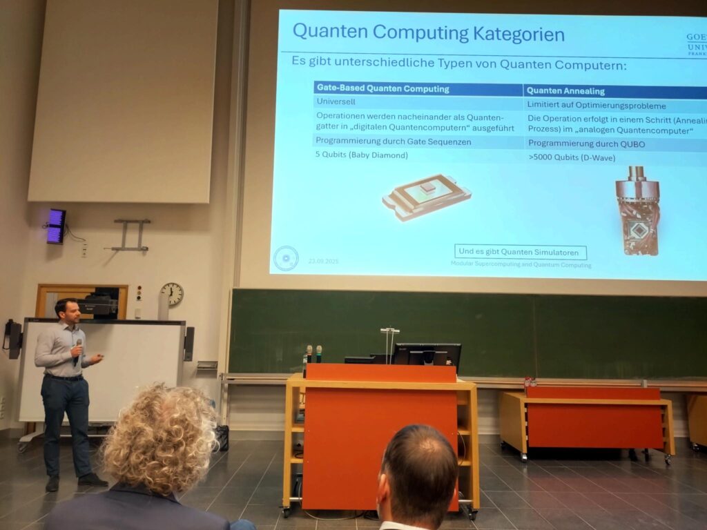 On January 16, 2023, a group of Goethe University students spent a day at the Jülich Supercomputing Centre. The students were able to talk to leading experts in the modular supercomputing, high performance computing (HPC), and quantum computing domains. In addition, the students had the opportunity to visit the HPC and quantum computing facilities, including the JUWELS supercomputer and JUNIQ.